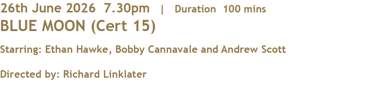 Richard Linklater's Blue Moon tells the story of legendary lyricist Lorenz Hart bravely facing the future as his professional and private life unravel at the opening night party for his former partner's hit show Oklahoma. By the time this night is over, Hart will have confronted both a world that no longer values his talent and the seeming impossibility of love.